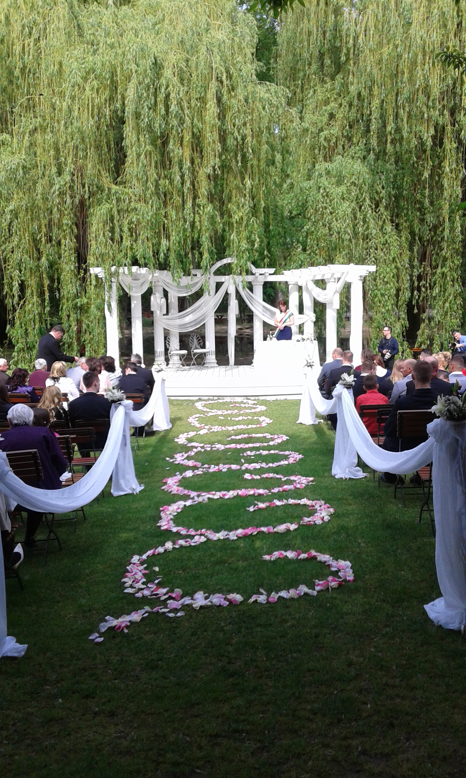 A ceremónia helyszínén tartalmazza a boldogságkapu, a kiválasztott háttér és az angyalfák virággal és textillel való dekorációját, valamint a virágdíszt az anyakönyvvezető asztalára.