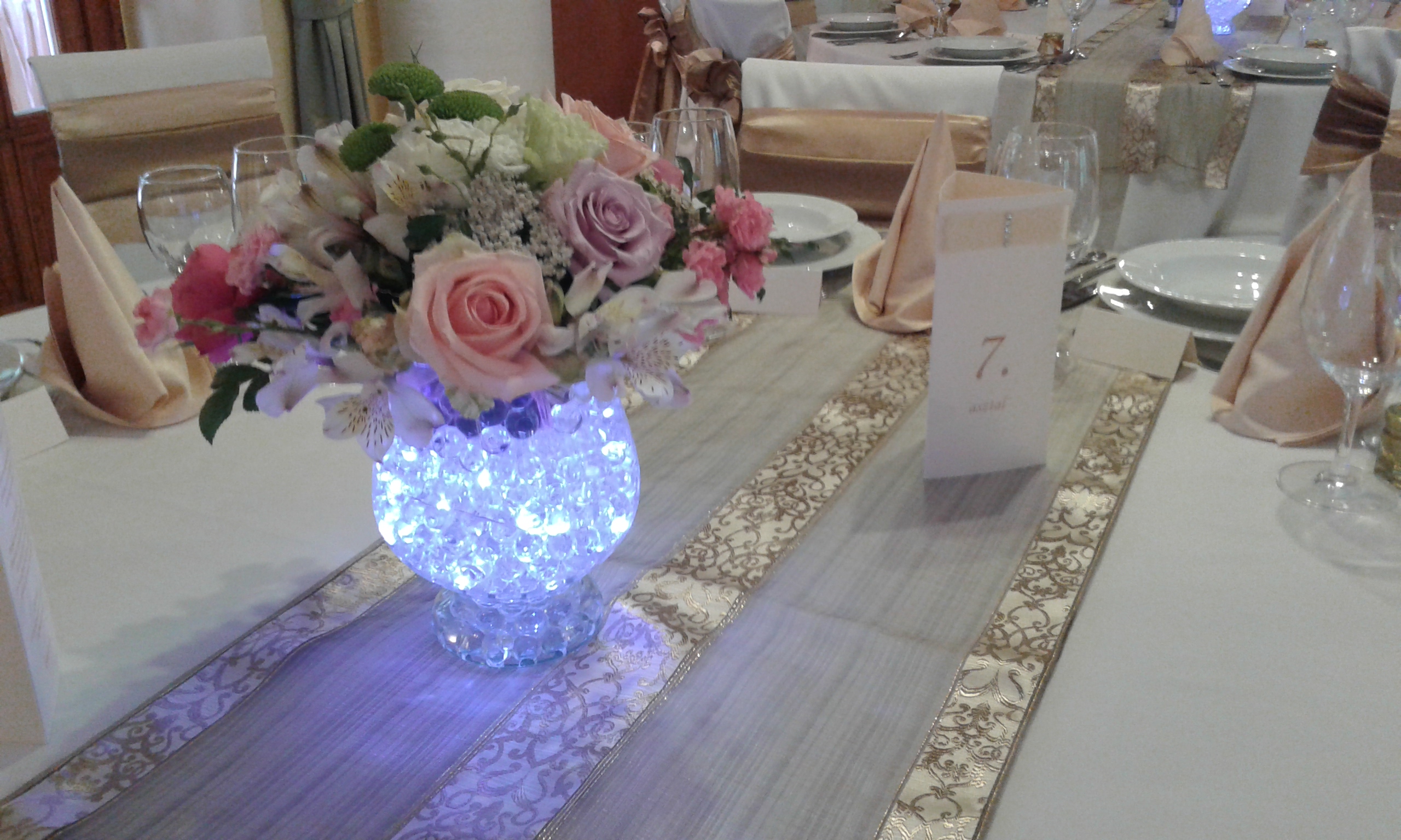 A dekoráció tartalma a következő: a főasztal és a háttér díszítése textillel, virággal és fényfűzérrel, a mennyezet dekorálása selyemmel, a vendégek asztalaira 8 főnként virágdísz, szalagcsík, szirom vagy gyöngyök és mécsesek.